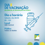 Se ao longo da Campanha são promovidos os chamados “Dia D” de vacinação, quando mutirões em horários especiais buscam alavancar a vacinação, Estrela programa outras datas extras. O Dia Estrela, ou “Dia E” de vacinação serão plantões a serem realizados nos finais de semana em horários especiais. O primeiro deve ocorrer no próximo sábado, dia 08 de maio, das 8h às 12h, no Posto Central, no Bairro Oriental.
