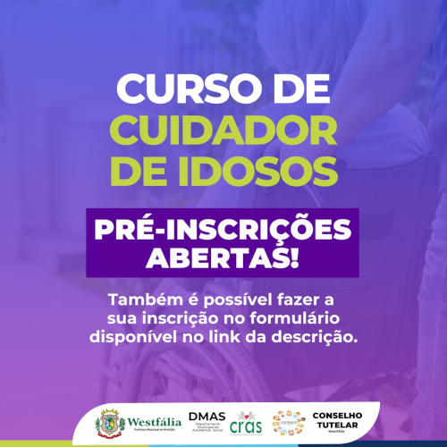 Com o intuito de promover o bem-estar aos idosos e capacitar munícipes para que atendam as necessidades deste público, o município de Westfália abriu as pré-inscrições para o Curso de Cuidador de Idosos. As mesmas seguem abertas até o dia 14 de junho (sexta-feira), de forma virtual ou presencial, no horário de atendimento da Assistência Social.