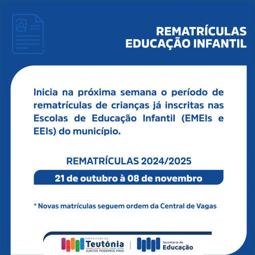 Inicia na próxima semana o período de rematrículas para os alunos da Educação Infantil e do Ensino Fundamental de Teutônia. |