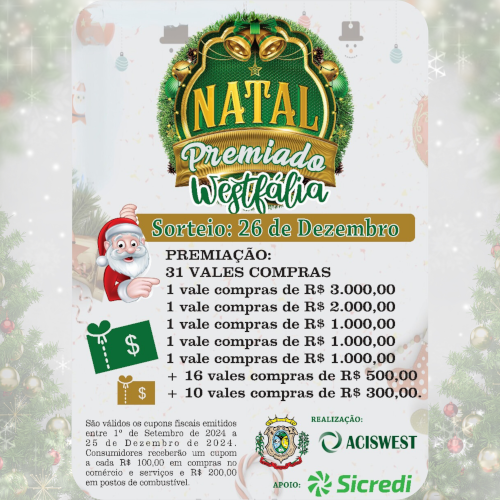 A cidade de Westfália se prepara para celebrar as festividades de fim de ano com uma edição especial do Natal Premiado, uma iniciativa que promete movimentar o comércio local e incentivar o consumo no Município. O sorteio será realizado no dia 26 de dezembro (quinta-feira) e distribuirá um total de 31 vale-compras.