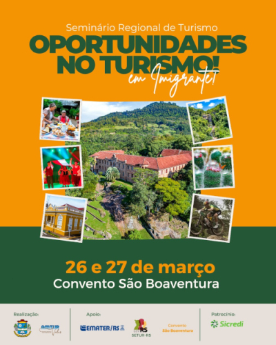 A Prefeitura de Imigrante, em parceria com a Associação dos Municípios de Turismo da Região dos Vales (AMTURVALES), anuncia a abertura das inscrições para o Seminário Regional de Turismo – "Oportunidades no Turismo". O evento será realizado nos dias 26 e 27 de março, no Convento São Boaventura, em Imigrante, e contará com uma programação abrangente voltada ao desenvolvimento do turismo regional.