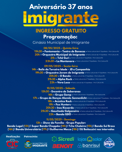 “Imigrante está de aniversário e aniversários precisam ser comemorados. O município completa 37 anos de uma bela história de dedicação, empenho e trabalho, que resultaram em diversas conquistas e em uma cidade cada vez melhor de se viver”, destaca o secretário de Cultura, Desporto e Turismo, Charles Porsche.