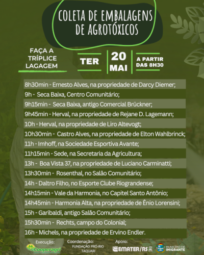 A Administração Municipal de Imigrante, em parceria com a Cooperagri, a Fundação Pró-Rio Taquari e com apoio da Emater/RS-Ascar, realiza a tradicional Coleta de Embalagens de Agrotóxicos na próxima terça-feira (20/5). A ação terá início às 8h30 e percorrerá diversas localidades do município ao longo do dia.