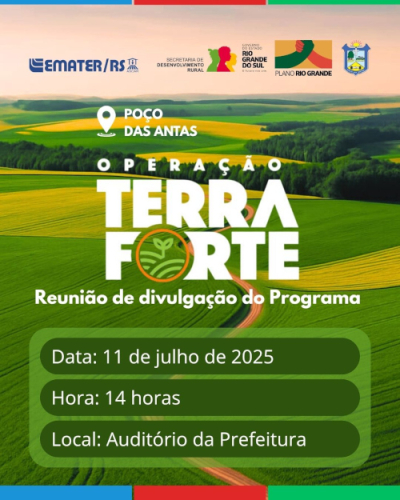 O município de Poço das Antas recebe na próxima sexta-feira, dia 11 de julho, a reunião de divulgação do programa Operação Terra Forte. A atividade ocorre às 14 horas, no Auditório da Prefeitura, e é organizada pela Emater/RS-Ascar, com apoio da Secretaria de Desenvolvimento Rural do Governo do Estado do Rio Grande do Sul.