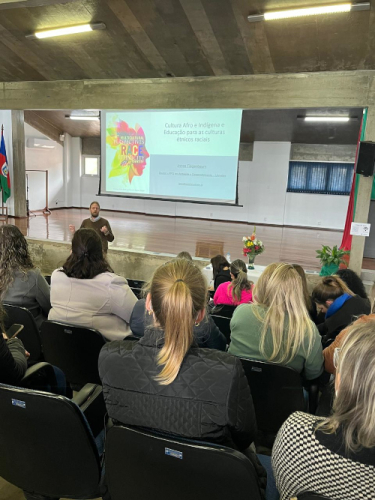 Pela manhã, a jornalista Luciana Brune conduziu uma palestra com o tema “Comunicação Não Violenta (CNV)”, apresentando reflexões e ferramentas voltadas à escuta ativa, empatia e melhoria das relações interpessoais no ambiente escolar. À tarde, o professor da Univates, Jones Fiegenbaum, abordou o tema “Cultura Afro e Indígena e Educação para as Culturas Étnico Raciais”, reforçando a importância da valorização da diversidade, do respeito às identidades e do cumprimento da legislação que trata do ensino da história e cultura afro-brasileira e indígena nas escolas.
