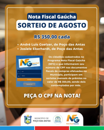 O sorteio do mês de agosto do Programa Nota Fiscal Gaúcha (NFG) contemplou dois moradores de Poço das Antas. Os ganhadores foram André Luis Goelzer e Josiele Eberhardt, que receberão, cada um, R$ 350,00.