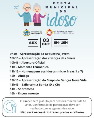 No dia 3 de outubro, a Administração Municipal de Imigrante, por meio da Secretaria de Saúde e Assistência Social, realiza a 32ª Festa Municipal do Idoso. O evento acontece das 9h às 16h, no Ginásio Municipal, e promete um dia de integração, homenagens e confraternização no município.