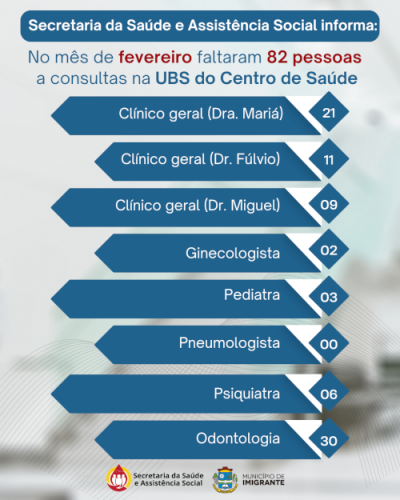A Secretaria Municipal de Saúde divulgou os números referentes ao mês de fevereiro, revelando um cenário preocupante: 93 pacientes faltaram às consultas agendadas, sendo 82 na UBS do Centro e 11 na UBS de Daltro Filho.