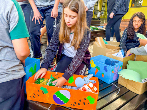 <p>As turmas do Turno Integral foram responsáveis por pintar e criar as cestas, enquanto os estudantes do 7º ano do Ensino Fundamental se envolveram diretamente na separação e organização dos alimentos. Arroz, feijão, massa, molho de tomate, farinha, café, leite, azeite, sal, açúcar e farofa preencheram as cestas solidárias, doadas pelo setor de Diaconia do CT à coordenação do Centro Municipal de Ensino Fundamental Leonel de Moura Brizola (CEMEF), de Teutônia, na terça-feira que antecedeu a Páscoa.</p>