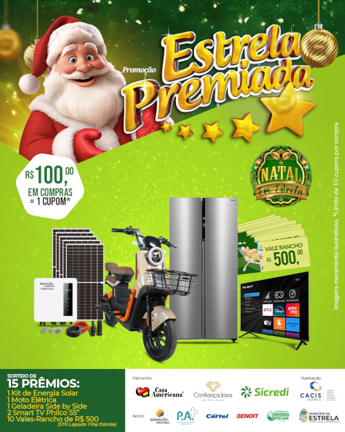 <p>Este ano, além dos patrocinadores fixos, a Estrela Premiada conta com o apoio de STR Lajeado; Geração Própria; PA+; Certel; Benoit e Prefeitura Municipal de Estrela, sendo que também faz parte da programação do Natal em Estrela. Terá dois sorteios, dias 28/11 e 26/12, com diversificada gama de prêmios: serão 10 vales-ranchos de R$ 500 cada no Supermercado STR Lajeado (filial Estrela); 2 TVs de 55 polegadas; uma geladeira Frost Free 442 litros; 1 Moto elétrica da marca FZK Scooter; e 1 Kit fotovoltaico completo.</p>