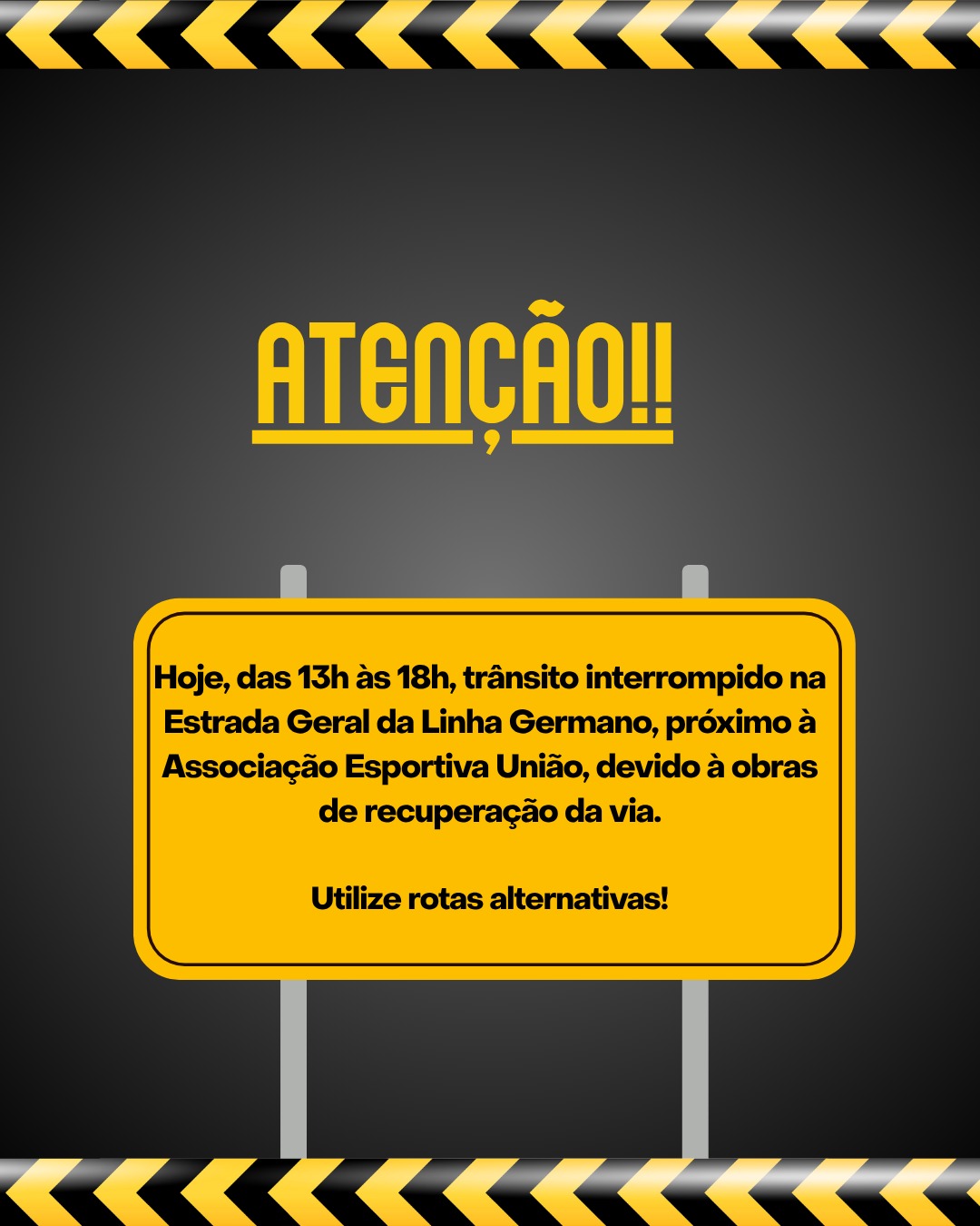 <p>Os motoristas e moradores devem observar os seguintes detalhes:<br /> • Data: Segunda-feira, 10 de novembro de 2025.<br /> • Horário: Das 13h às 18h.<br /> • Local: Estrada Geral da Linha Germano, nas proximidades da Associação Esportiva União.</p>
