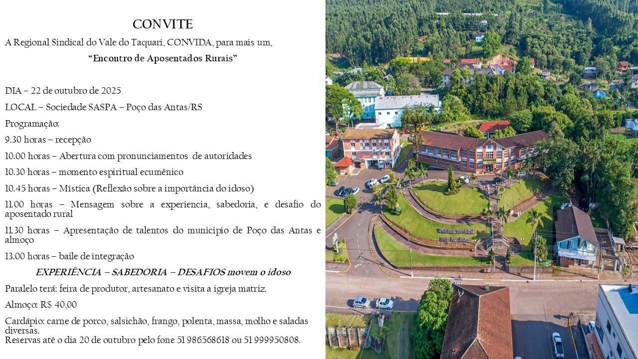 <p>Na próxima quarta-feira, dia 22 de outubro, Poço das Antas será sede de mais uma edição do Encontro de Aposentados Rurais, promovido pela Regional Sindical do Vale do Taquari. O evento ocorrerá na SASCPA, com início às 9h30, reunindo aposentados e trabalhadores rurais de diversos municípios da região.<br />A programação contempla momentos de integração, reflexão e confraternização, com destaque para o tema “Experiência, sabedoria e desafios movem o idoso”. O encontro busca valorizar a trajetória dos aposentados rurais, reconhecendo sua contribuição para o desenvolvimento do campo e das comunidades locais.<br />Entre as atividades previstas estão abertura com a presença de autoridades, momento espiritual ecumênico, reflexão sobre a importância do idoso, mensagem sobre sabedoria e experiência, além de apresentação de talentos locais e baile de integração. Paralelamente, haverá Feira do Produtor e Artesanato e visita à Igreja Matriz.<br />O valor do almoço é de R$ 40,00 e reservas podem ser feitas até hoje, segunda-feira, dia 20 de outubro, pelos telefones (51) 98656-8618 ou (51) 99995-0808.</p>