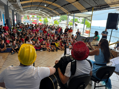 <p>Durante as atividades, os estudantes tiveram contato com um livro bilíngue, que traz músicas de sensibilização e histórias que abordam temas como diversidade e convivência. Em um segundo momento, os professores participaram de formações práticas, nas quais exploraram maneiras de trabalhar o material em sala de aula, ampliando o repertório didático com apoio musical e recursos criativos.</p>