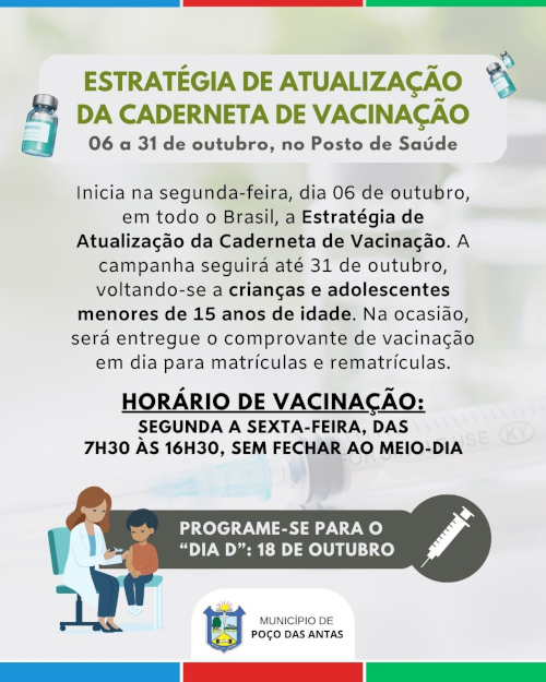 <p>Até 31 de outubro, a Unidade Básica de Saúde (UBS) de Poço das Antas está mobilizada para a Estratégia de Atualização da Caderneta de Vacinação. A ação, que ocorre em todo o Brasil, busca garantir que crianças e adolescentes menores de 15 anos estejam com todas as doses em dia.</p>