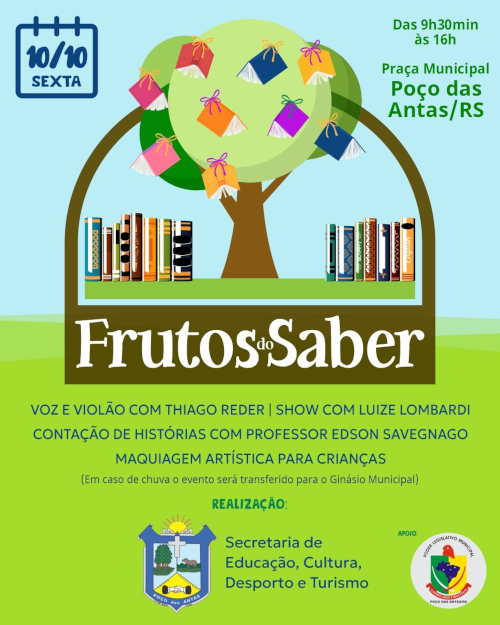 <p>A comunidade de Poço das Antas terá uma sexta-feira diferente no dia 10 de outubro, com a realização do evento “Frutos do Saber”, promovido pela Administração Municipal, por meio da Secretaria de Educação, Cultura, Desporto e Turismo, com apoio do Poder Legislativo. A programação, que também é alusiva ao Dia das Crianças, acontece na Praça Municipal, das 9h30 às 16 horas, reunindo atividades culturais, música e incentivo à leitura.</p>