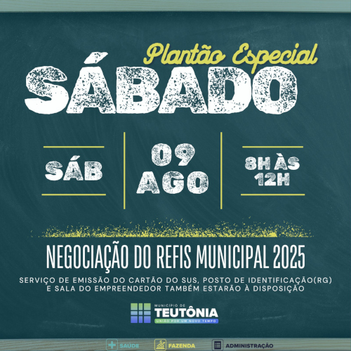 <p>A Administração Municipal de Teutônia promoverá, no sábado, 09 de agosto, um plantão especial da Secretaria da Fazenda, que estará aberta das 8h às 12h, com o objetivo de facilitar o acesso da população ao Programa Refis Municipal 2025.</p>