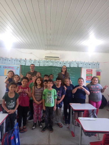 Abril é o mês de Prevenção Contra a Crueldade Animal, o Abril Laranja, e como forma de conscientizar e orientar a turma do programa Agente Mirim Ambiental sobre a importância do cuidado, amor e proteção aos animais domésticos, na manhã desta terça-feira (09), o veterinário do Departamento do Meio Ambiente Luis Cesar Schauenberg participou da aula realizada na Emef Odilo Afonso Thomé, juntamente, com a coordenadora da Sala Verde Luana Hermes.