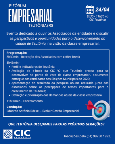A CIC Teutônia, exercendo sua representatividade na prática, procurando auxiliar e levar adiante os anseios da classe empresarial, em especial dos seus cerca de 550 associados, promove o 1º Fórum Empresarial de Teutônia. Será na próxima quarta-feira, dia 24 de abril, das 8h30min às 11h30min, tendo por local a Sede da entidade, numa iniciativa da Diretoria Administrativa.