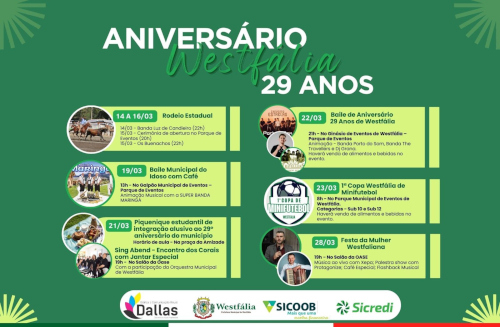 O município de Westfália completa, neste mês de março, 29 anos de história, progresso e desenvolvimento. Para celebrar esta importante data, a Administração Municipal preparou uma programação diversificada, voltada para toda a comunidade, com atividades culturais, esportivas e festivas. Entre os dias 14 e 28 de março, os cidadãos poderão participar de eventos que ressaltam as tradições locais e promovem momentos de integração e lazer.