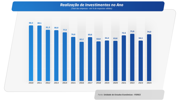 O levantamento mostra ainda que 74,3% das empresas conseguiram realizar investimentos no ano passado. Inovação tecnológica e capital humano foram as principais ações estratégicas desenvolvidas. “Os resultados confirmam a resiliência do gaúcho, que apesar de todas as dificuldades provocadas pela tragédia das enchentes do ano passado, consegue se reerguer. Muitas indústrias foram afetadas e precisaram recomeçar praticamente do zero, sendo reconstruídas para voltar a operar, mas a disposição para investir se manteve e até cresceu”, destaca o presidente da FIERGS, Claudio Bier.