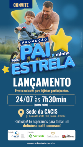 A Câmara de Comércio, Indústrias, Serviços e Agronegócio (Cacis) de Estrela agendou, para a manhã desta quinta-feira (24), o lançamento de mais uma promoção de incentivo ao comércio do município e demais setores. Após o sucesso do “Mês dos Namorados”, cujo prêmio final foi desfrutado na última semana por um dos casais sorteados, será a vez dos “pais” receberem atenção especial por parte entidade, lojistas, prestadores de serviços e outros. Detalhes da campanha “Meu Pai, Minha Estrela” serão divulgados em café a partir das 7h30min, na sede da Cacis, na presença de diretores, empresas participantes, lojistas e demais convidados.