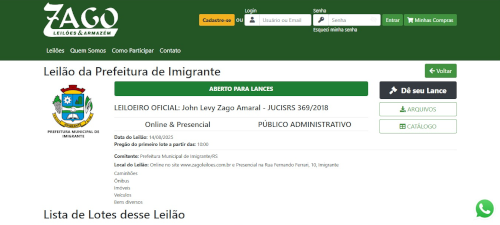 A participação poderá ocorrer presencialmente na Secretaria de Obras e Mobilidade Urbana, localizada na Rua Fernando Ferrari, nº 10, Centro de Imigrante, ou pelo site oficial do leiloeiro: www.zagoleiloes.com.br. Interessados poderão agendar visitação aos bens por meio dos contatos indicados no edital.