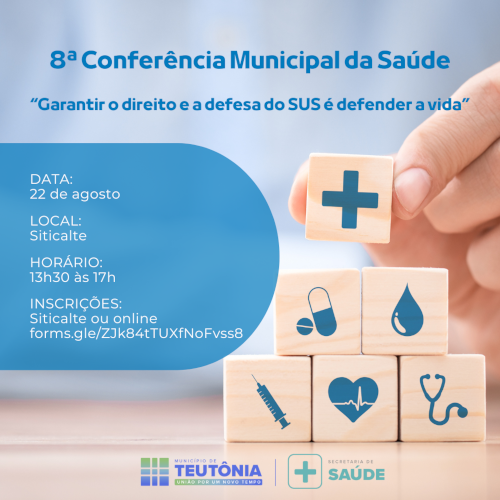 A Prefeitura de Teutônia, por meio da Secretaria Municipal de Saúde, convida a população para a 8ª Conferência Municipal de Saúde, que ocorrerá no dia 22 de agosto de 2025, no Sindicato dos Trabalhadores nas Indústrias Calçadistas e do Vestuário de Teutônia (Siticalte), localizado na Rua Carlos Arnt, nº 618, Bairro Canabarro. O evento terá início às 13h30 e término às 17h, com o tema “Garantir o direito e a defesa do SUS é defender a vida”.