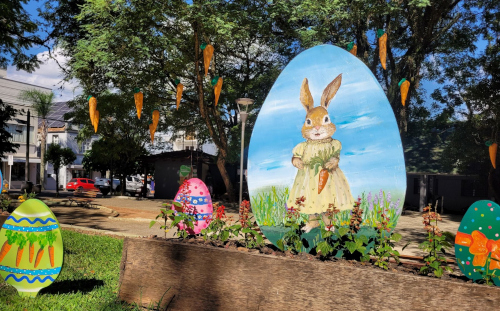 O clima de Páscoa já começa a tomar conta de Arroio do Meio. A decoração temática foi instalada na Praça Flores da Cunha e em outros espaços públicos da cidade, trazendo cores, símbolos e elementos que remetem à celebração e convidam a comunidade a entrar no espírito da data. Os enfeites foram produzidos no Centro de Referência de Assistência Social (CRAS), com a participação de oficineiras e integrantes dos grupos atendidos no local.