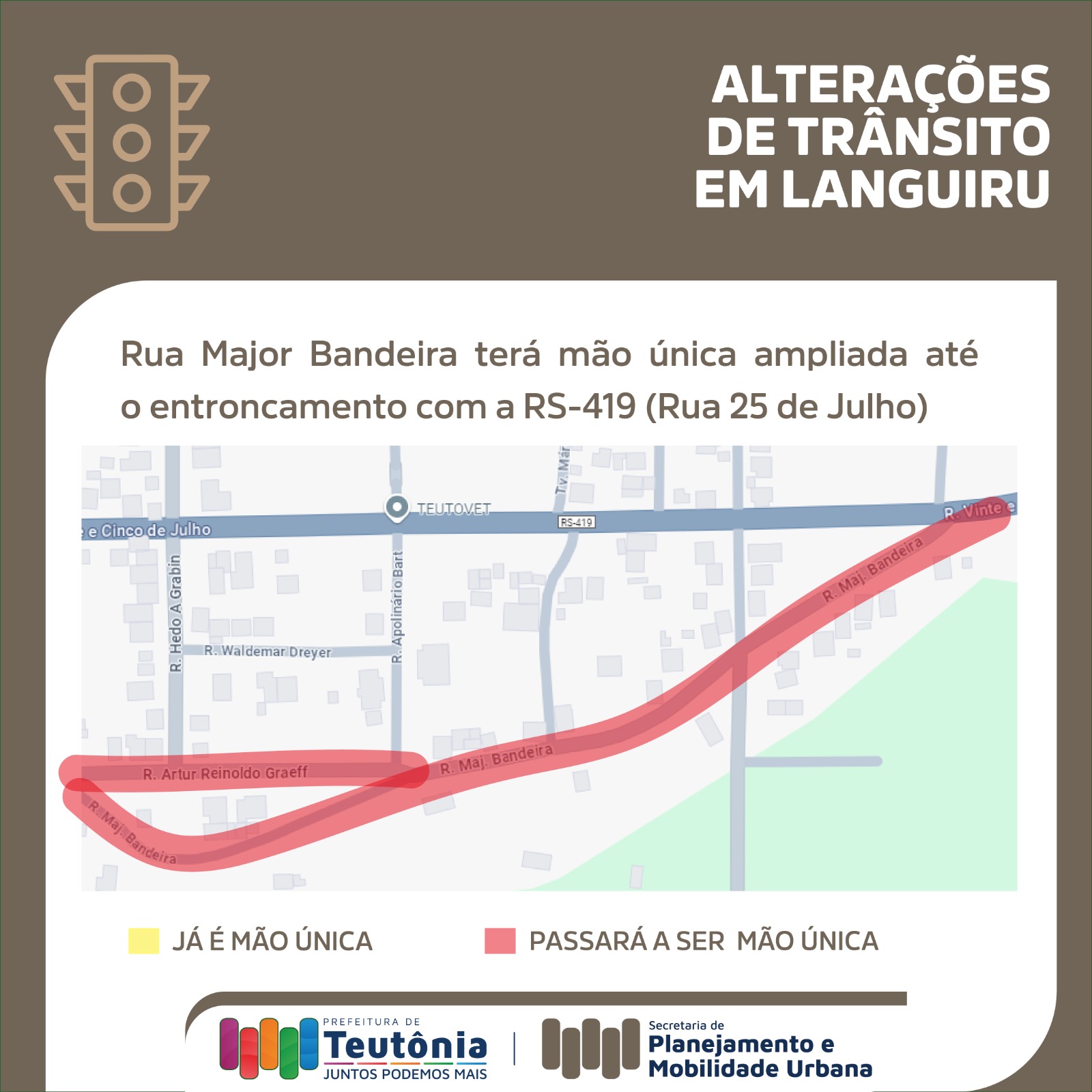 <p>A primeira delas se refere à ampliação da mão única da Rua Major Bandeira, que passará a ter sentido único também no trecho entre a Rua 7 de Setembro e o entroncamento com a RS-419 (Rua 25 de Julho) – alteração que contemplará também a Rua Artur Reinoldo Graeff. Outro trecho a ser modificado é o da Rua Pedro Schneider, entre as ruas Major Bandeira e Fernando Ferrari, proximidades do antigo Centro Cultural 25 de Julho e da Unidade Básica de Saúde de Languiru. <br />As alterações entrarão em vigor a partir das 8h do dia 18 de novembro de 2024, uma segunda-feira. O objetivo das mudanças, segundo o Diretor do Departamento de Trânsito de Teutônia, Carlos Peixoto, é promover melhorias na mobilidade urbana e proporcionar mais segurança àqueles que trafegam pelo centro do Bairro Languiru.</p>