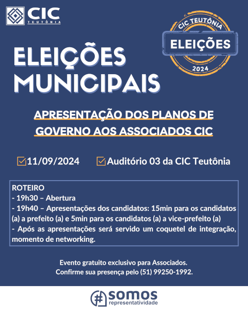 <p>Na próxima quarta-feira, dia 11, às 19h30min, a CIC realiza evento especial com os candidatos a prefeito e vice-prefeito de Teutônia. Tendo por local o Auditório 03 da entidade, as chapas apresentam seus planos de governo em evento gratuito dirigido exclusivamente aos associados da CIC.</p>