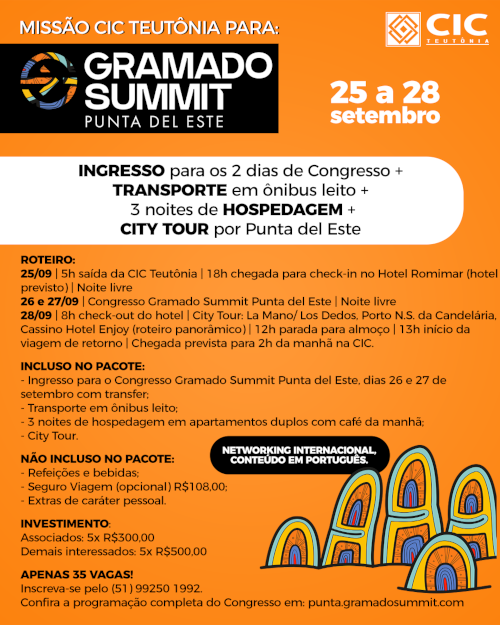<p>A CIC Teutônia está organizando missão empresarial para o Gramado Summit de Punta del Este, no Uruguai, que ocorre nos dias 26 e 27 de setembro. A programação da comitiva teutoniense se estende de 25 a 28 daquele mês, com transporte em ônibus leito, ingressos para os dois dias do evento, três noites de hospedagem (apartamento duplo com café da manhã) e city tour.</p>