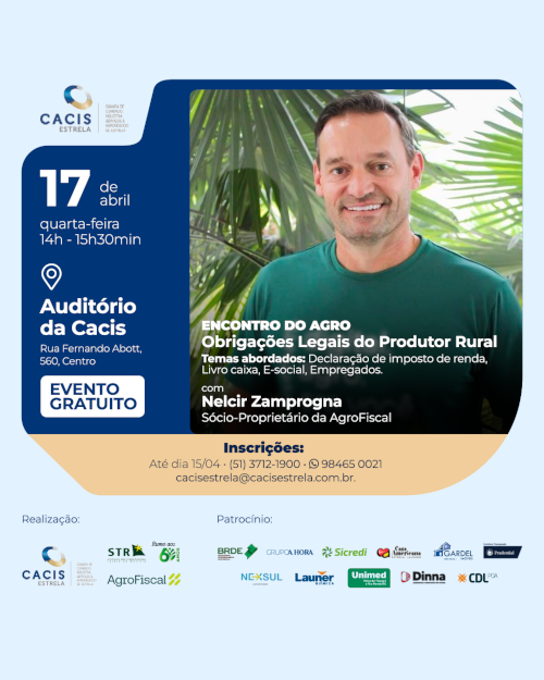 <p>A Câmara de Comércio, Indústria, Serviços e Agronegócio (Cacis) de Estrela, por meio da vice-presidência do Agronegócio, realiza no dia 17 de abril o Encontro do Agro, que tratará sobre “Obrigações legais do produtor rural”. Na ocasião, serão abordados os seguintes temas: declaração do Imposto de Renda, livro-caixa, E-Social e empregados.</p>