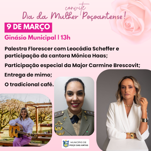 <p class="selectable-text">O Município de Poço das Antas, por meio da Secretaria de Assistência Social, realiza neste sábado, dia 9 de março, no Ginásio Municipal, o Dia da Mulher Poçoantense. A programação terá início às 13h com a seguinte programação:</p>