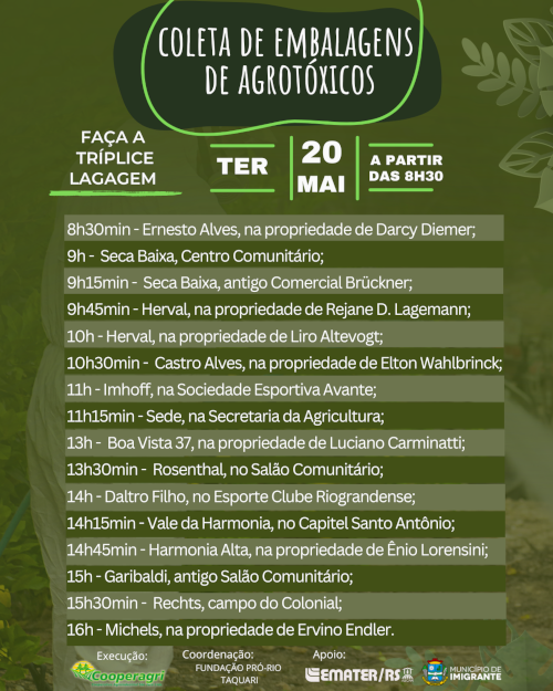 <p>A Administração Municipal de Imigrante, em parceria com a Cooperagri, a Fundação Pró-Rio Taquari e com apoio da Emater/RS-Ascar, realiza a tradicional Coleta de Embalagens de Agrotóxicos na próxima terça-feira (20/5). A ação terá início às 8h30 e percorrerá diversas localidades do município ao longo do dia.</p>