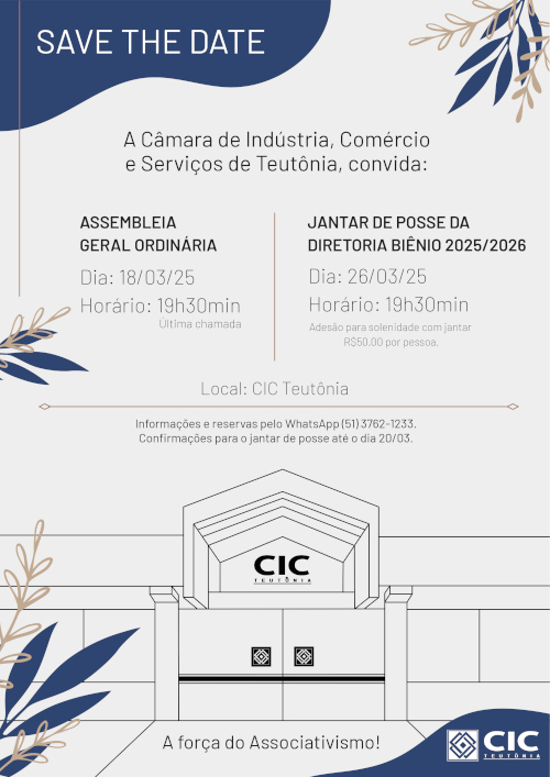 <p>A Câmara de Indústria, Comércio e Serviços de Teutônia (CIC) convida seus associados para a Assembleia Geral Ordinária, que será realizada no dia 18 de março de 2025, no auditório da sede da entidade. A primeira convocação ocorrerá às 18h, com a presença da maioria absoluta dos associados quites com suas obrigações pecuniárias e em pleno gozo de seus direitos perante esta Entidade, e, caso não verificado esse quórum funcionará em segunda convocação, às 18h30min horas, com a presença de, no mínimo, 1/3 (um terço) dos associados e, se ainda não for registrado o quórum específico, funcionará validamente em terceira e última convocação às 19h, com a presença de qualquer número de associados, num mínimo de dez associados.</p>