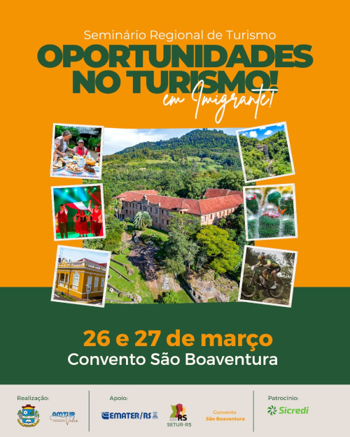 <p>A Prefeitura de Imigrante, em parceria com a Associação dos Municípios de Turismo da Região dos Vales (AMTURVALES), anuncia a abertura das inscrições para o Seminário Regional de Turismo – "Oportunidades no Turismo". O evento será realizado nos dias 26 e 27 de março, no Convento São Boaventura, em Imigrante, e contará com uma programação abrangente voltada ao desenvolvimento do turismo regional.</p>