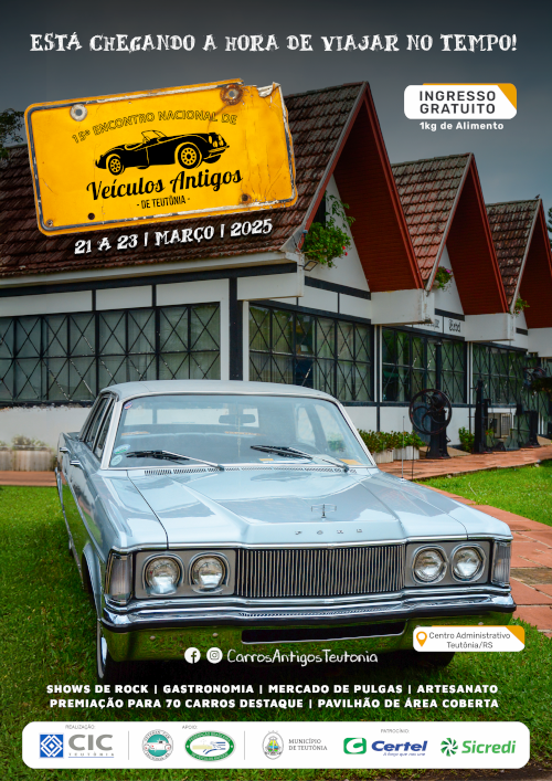 <p>Os apaixonados pelo antigomobilismo têm um encontro marcado em Teutônia, entre os dias <strong>21 e 23 de março de 2025</strong>, no Centro Administrativo. O evento promete reunir veículos clássicos, além dos veículos, haverá infraestrutura de brinquedos infláveis e atrações para as crianças, “mercado de pulgas” e memorabília (setor de venda de peças, acessórios, confecções, canecas, quadros, brinquedos, miniaturas, materiais personalizados de veículos antigos, entre outros), artesanato, área coberta para exposição com 3.600m², área para motorhomes e acampamento, restaurante climatizado servindo o prato típico de Teutônia (carne suína assada – <em>Schweinebraten</em>) e praça de alimentação. O ponto alto da programação será o <strong>Desfile de Premiação dos Carros Destaque</strong> e o <strong>show nacional com a banda Vera Loca</strong>, fechando o fim de semana com chave de ouro.</p>