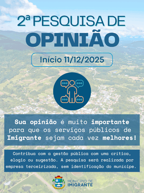 <p>A Administração Municipal de Imigrante inicia, a partir desta quinta-feira, dia 11, a segunda Pesquisa de Opinião Pública, dando continuidade ao trabalho realizado no primeiro semestre. Assim como na etapa anterior, a coleta de dados será conduzida pela equipe de pesquisadores do Instituto de Estudos e Pesquisas Inovação, que possui mais de 20 anos de experiência e também foi responsável pela primeira pesquisa realizada em 2025. </p>