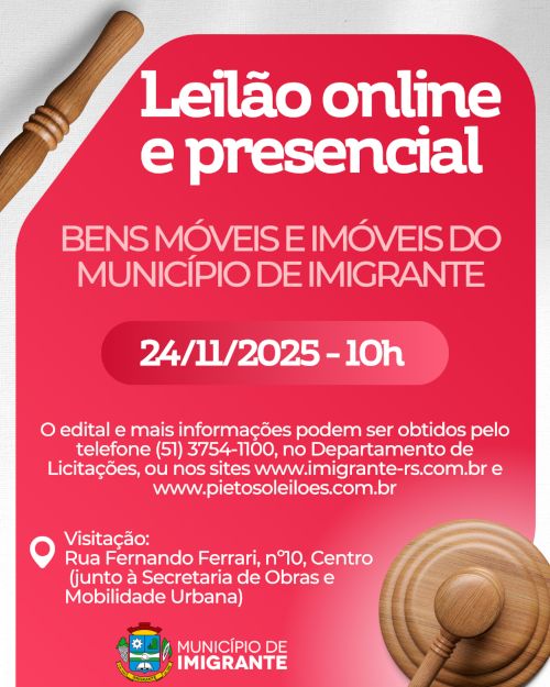<p>A Administração Municipal de Imigrante realiza, no dia 24 de novembro, às 10h, um leilão público de bens móveis e imóveis, nas modalidades <em>online</em> e presencial.</p>