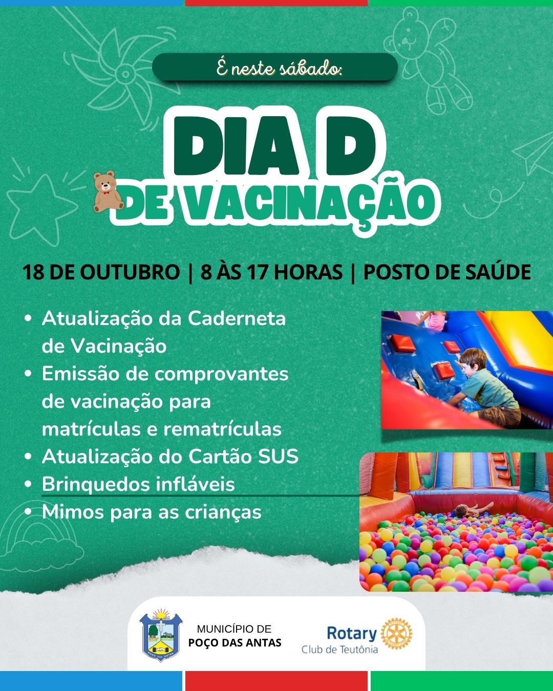 <p>O próximo sábado, dia 18 de outubro, será de cuidado e diversão em Poço das Antas. A Secretaria de Saúde promove o “Dia D” de Vacinação, das 8 horas às 17 horas – sem fechar ao meio-dia, na Unidade Básica de Saúde (UBS), com uma programação especial para toda a comunidade.<br />Durante o dia, será realizada a atualização da Caderneta de Vacinação de crianças e adolescentes menores de 15 anos de idade, bem como a emissão de comprovantes de vacinação – documentos necessários para matrículas e rematrículas escolares. Também será possível atualizar o Cartão SUS.<br />Além das ações de saúde, o evento contará com brinquedos infláveis e mimos para as crianças, tornando o momento mais leve e divertido. “O Dia D é uma grande oportunidade para que as famílias mantenham a saúde das crianças em dia e reforcem a proteção contra diversas doenças. Vacinar é um ato de amor e de responsabilidade coletiva”, destacou o secretário de Saúde, Juliano Körner.<br />A Secretaria de Saúde reforça o convite para que toda a comunidade prestigie o “Dia D”. A iniciativa conta com o apoio do Rotary Club.</p>