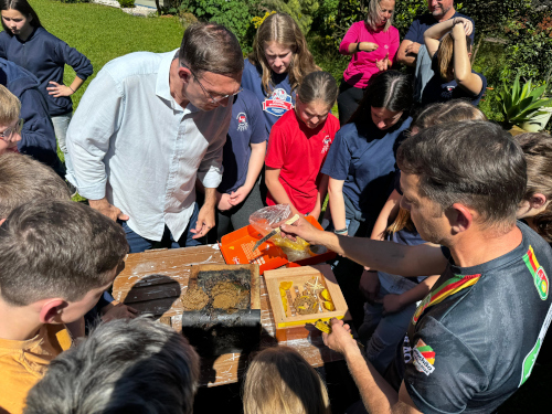 <p>Eles tiveram a oportunidade de visitar a casa do pai de uma das alunas, Ronei Zwirtes, que possui uma colmeia em seu quintal e mais de 40 tipos de abelhas. Durante a visita, ele apresentou todo o funcionamento desse sistema — como é feito o manejo das colmeias, o processo de transferência, a coleta do mel e os cuidados necessários com as abelhas.</p>