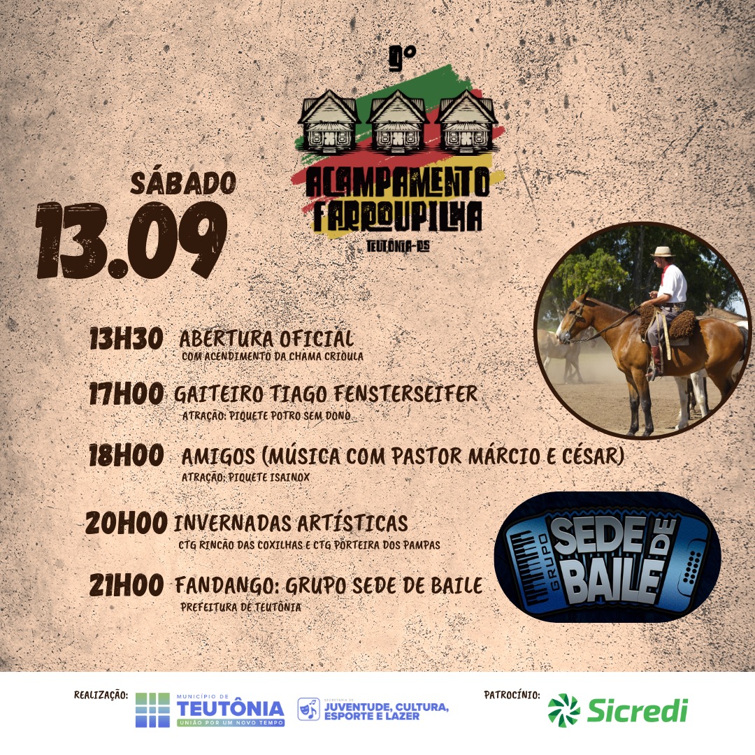 <p>Confira a programação completa:<br />Sábado, 13/09<br />13h30: Abertura Oficial, com acendimento da Chama Crioula<br />17h: Gaiteiro Tiago Fensterseifer (atração Piquete Potro Sem Dono)<br />18h: Amigos – Música com Pastor Márcio e Cézar Klein (atração Piquete Isainox)<br />20h: Invernadas Artísticas dos CTGs Rincão das Coxilhas e Porteira dos Pampas<br />21h: Fandango com o grupo Sede de Baile.</p>