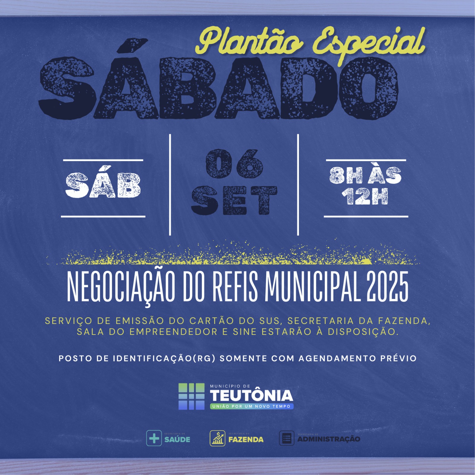 <p>A Administração Municipal de Teutônia promoverá, no sábado, 06 de setembro, um plantão especial da Secretaria da Fazenda, que estará aberta das 8h às 12h, com o objetivo de facilitar o acesso da população ao Programa Refis Municipal 2025.</p>