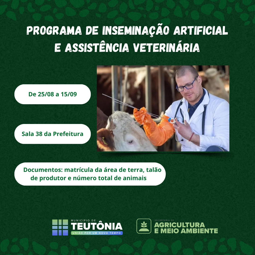 estão oficialmente abertas as inscrições para o programa que subsidia a Inseminação Artificial e a Assistência Veterinária. O período para se inscrever é de 25 de agosto a 15 de setembro de 2025.
