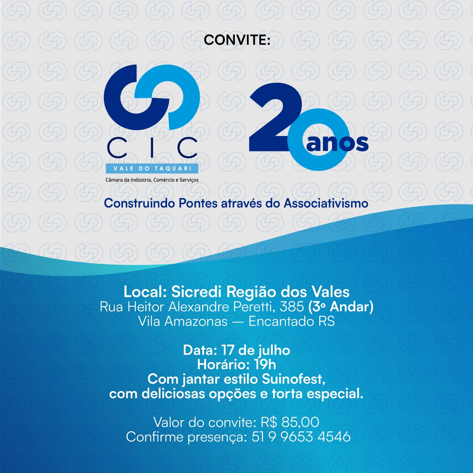 <p>A Câmara da Indústria, Comércio e Serviços do Vale do Taquari (CIC VT) comemora seu 20º aniversário com uma programação especial <strong>nesta quinta-feira, 17 de julho</strong>, a partir das 19h, na sede da <strong>Sicredi Região dos Vales</strong>, no 3º andar, em Encantado.</p>