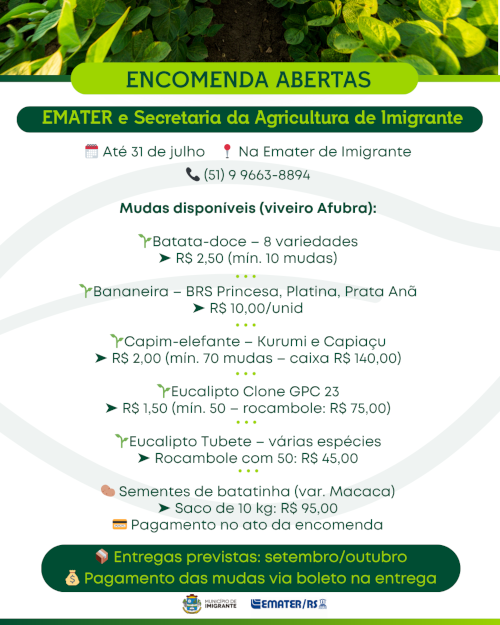 <p>A Emater/RS-Ascar de Imigrante, em parceria com a Secretaria de Agricultura, Meio Ambiente e Desenvolvimento Econômico, está com pedidos abertos para encomenda de diversas mudas e sementes destinadas aos produtores do município. As encomendas podem ser realizadas até o dia 31 de julho. </p>